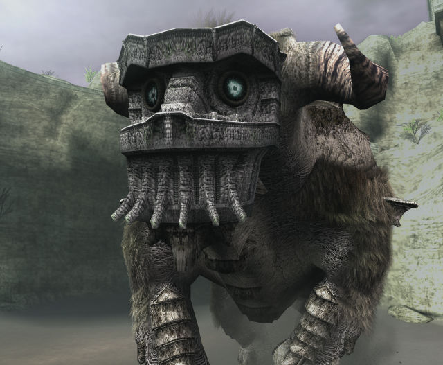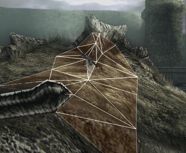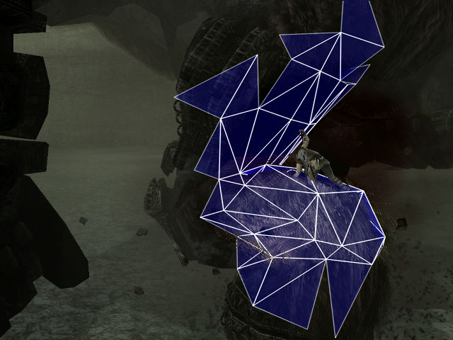 In SOTC, the colossus model is to some extent what could be called the "landscape", but when this model swings an arm around, or twirls his whole body around, using an inflexible collision model is not a great idea. If we were to use a system of cubes and spheres, it would be very apparent when you got up close to the colossus, which is not good.
